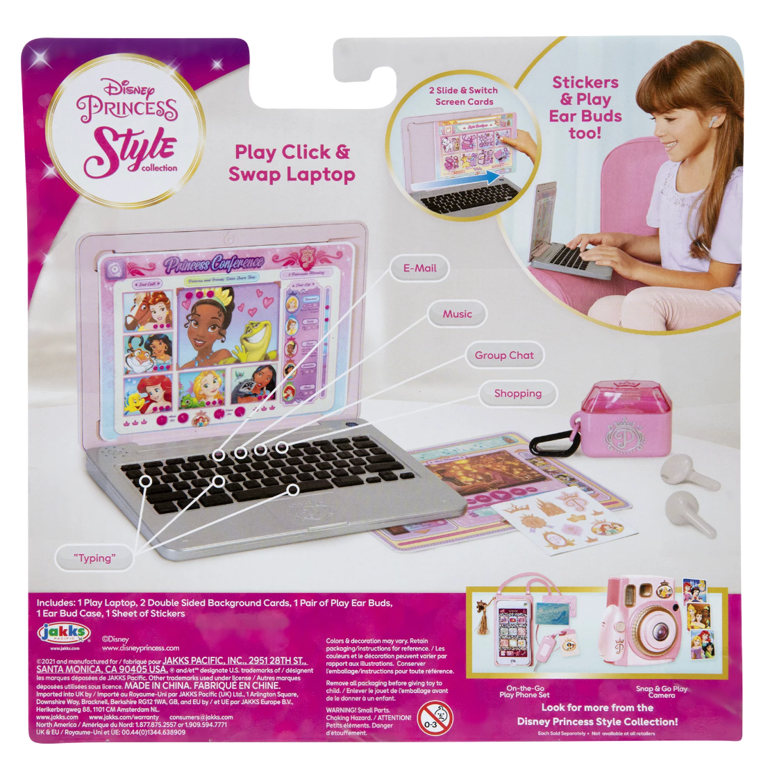 Esta vanguardista computadora portátil Play Click & Swap de Disney Princess Style Collection ofrece una experiencia de juego fantástica, realista y divertida. ¡Con cinco modos únicos para elegir, puedes divertirte pretendiendo "enviar correos electrónicos", "chatear" y "comprar" con tus princesas de Disney favoritas! Cada botón del teclado proporciona un clic realista cuando se presiona, creando una experiencia inmersiva en el modo de juego libre. Los otros cuatro modos se activan mediante los íconos de la "tecla F" e incluyen música, compras, correo electrónico y video chat. Las dos tarjetas de pantalla de doble cara incluidas corresponden a los modos de juego y se pueden intercambiar para disfrutar de una diversión sin fin. Mantente conectado con tus Princesas Disney favoritas usando frases "inteligentes" y efectos de sonido. ¡Personalice su computadora portátil con las pegatinas incluidas y luce una apariencia moderna y de alta tecnología con los auriculares "inalámbricos" de Play! ¡Disfruta de 5 formas diferentes de jugar, con más de 15 frases, sonidos y música! Incluye 1 computadora portátil, 2 pantallas de escritorio de doble cara,
