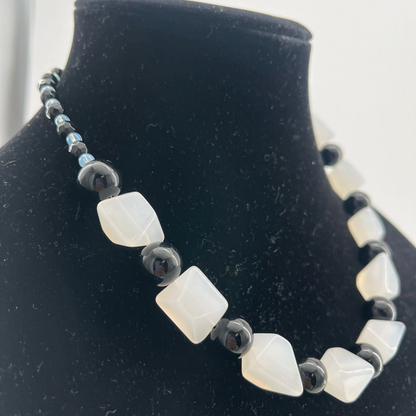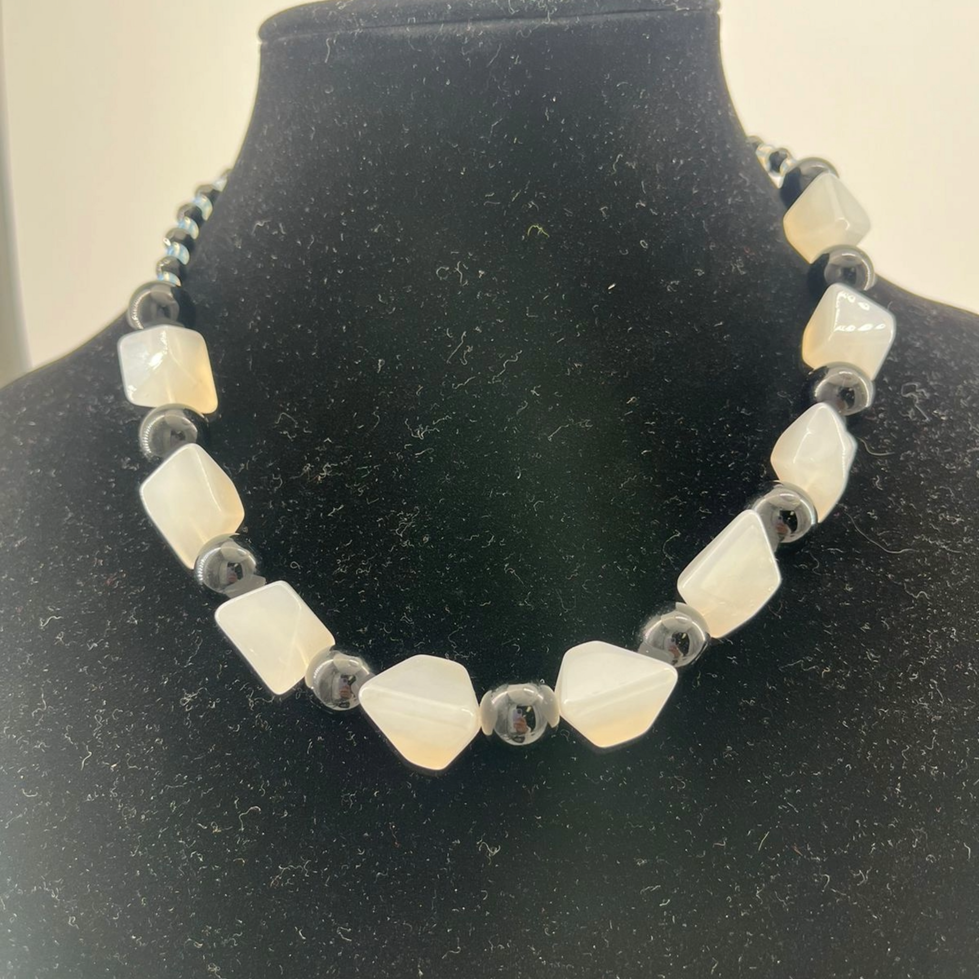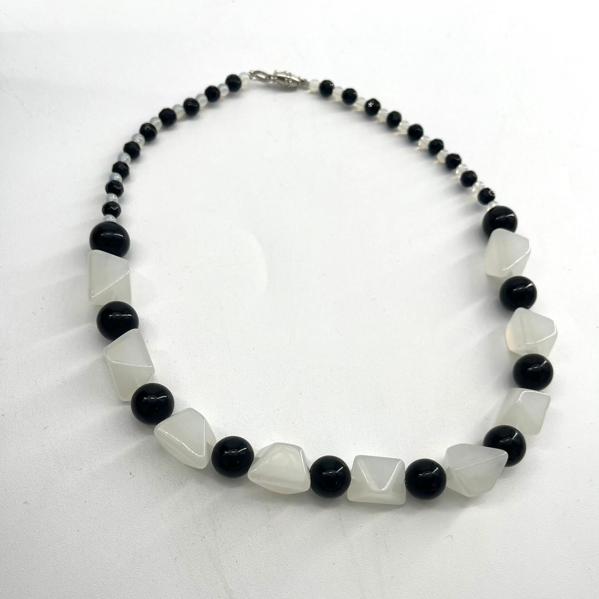 Expertly crafted, this Black and White Bead Necklace features an elegant design that effortlessly adds a touch of sophistication to any outfit. The combination of black and white beads creates a timeless look, while the high-quality materials ensure long-lasting wear. Elevate your style with this stunning accessory.