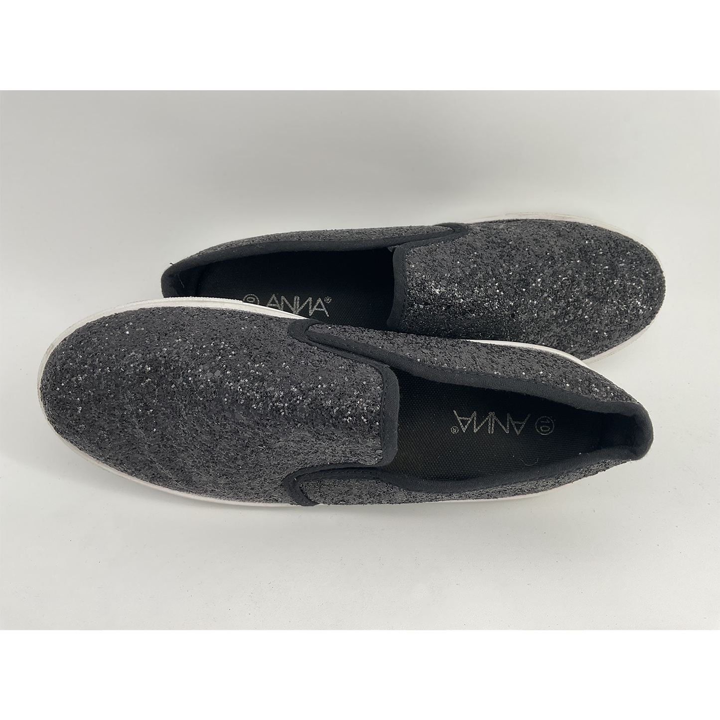 Upgrade your shoe collection with these stylish Black Glitter Slip-Ons for Women by Anna. Designed with a sleek, slip-on silhouette, these shoes are perfect for any occasion. The sparkling glitter adds a playful touch to any outfit. Available in sizes 8-10. Upgrade your wardrobe with these must-have shoes.