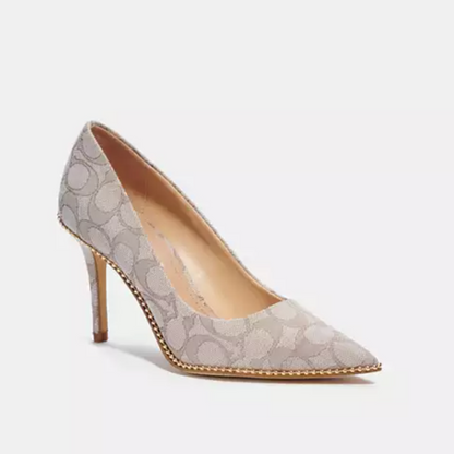 Elevate your style with the COACH Waverly Pump in color stone, size US 8. Crafted with a signature jacquard upper and a leather footbed, these pumps offer comfort and sophistication. Slip them on and enjoy a 3.5" heel height for a sleek and polished look. Style number C5923.