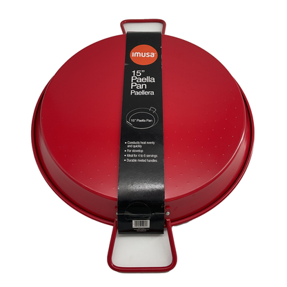 The Paella 15" Pan by Imusa is the perfect addition to your kitchen. Made of durable carbon steel, this pan conducts heat evenly and quickly for delicious paella every time. The riveted handles provide a secure grip for easy maneuvering. Upgrade your cooking game with this professional-grade pan.