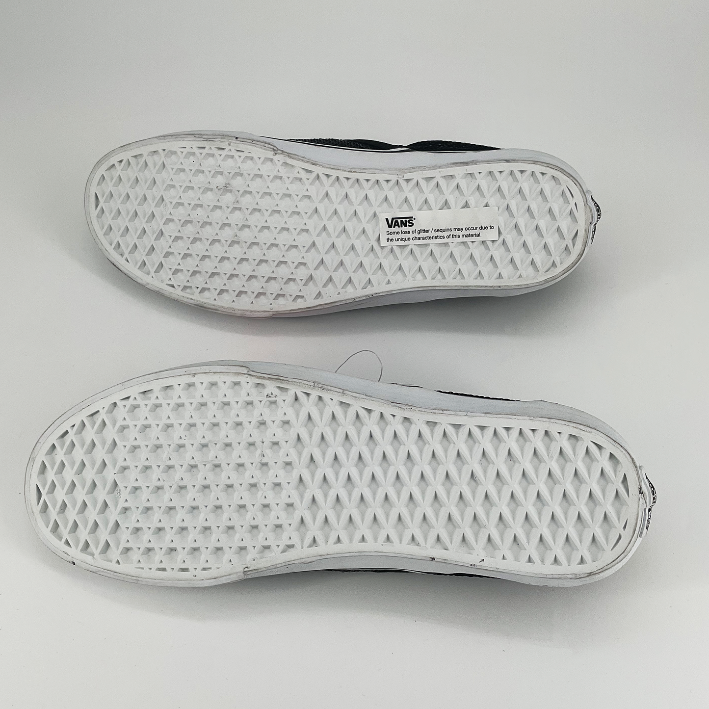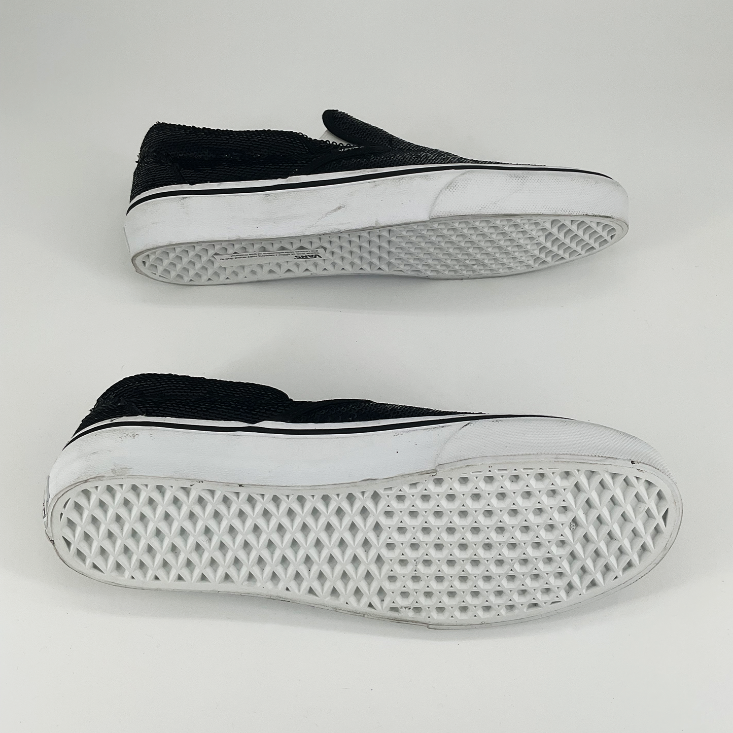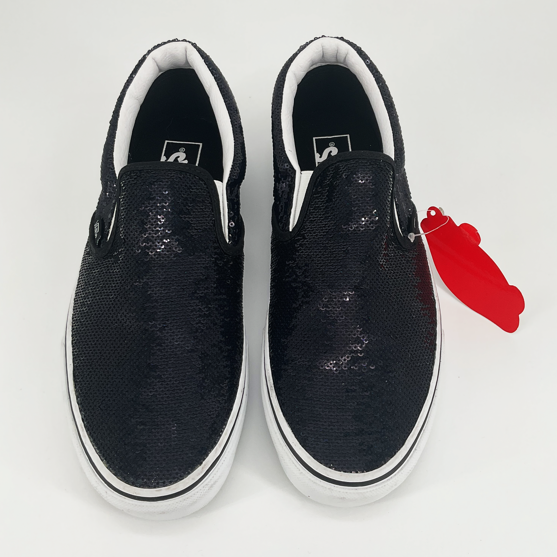 Add a little sparkle to your shoe game with the Sequin Vans Classic Slip On Shoes. Featuring a black sequin design and a comfortable slip-on style, these shoes will elevate any outfit. Available in US size 8.5 for women and 10 for men. Perfect for any fashion-forward individual looking for a touch of glamour.