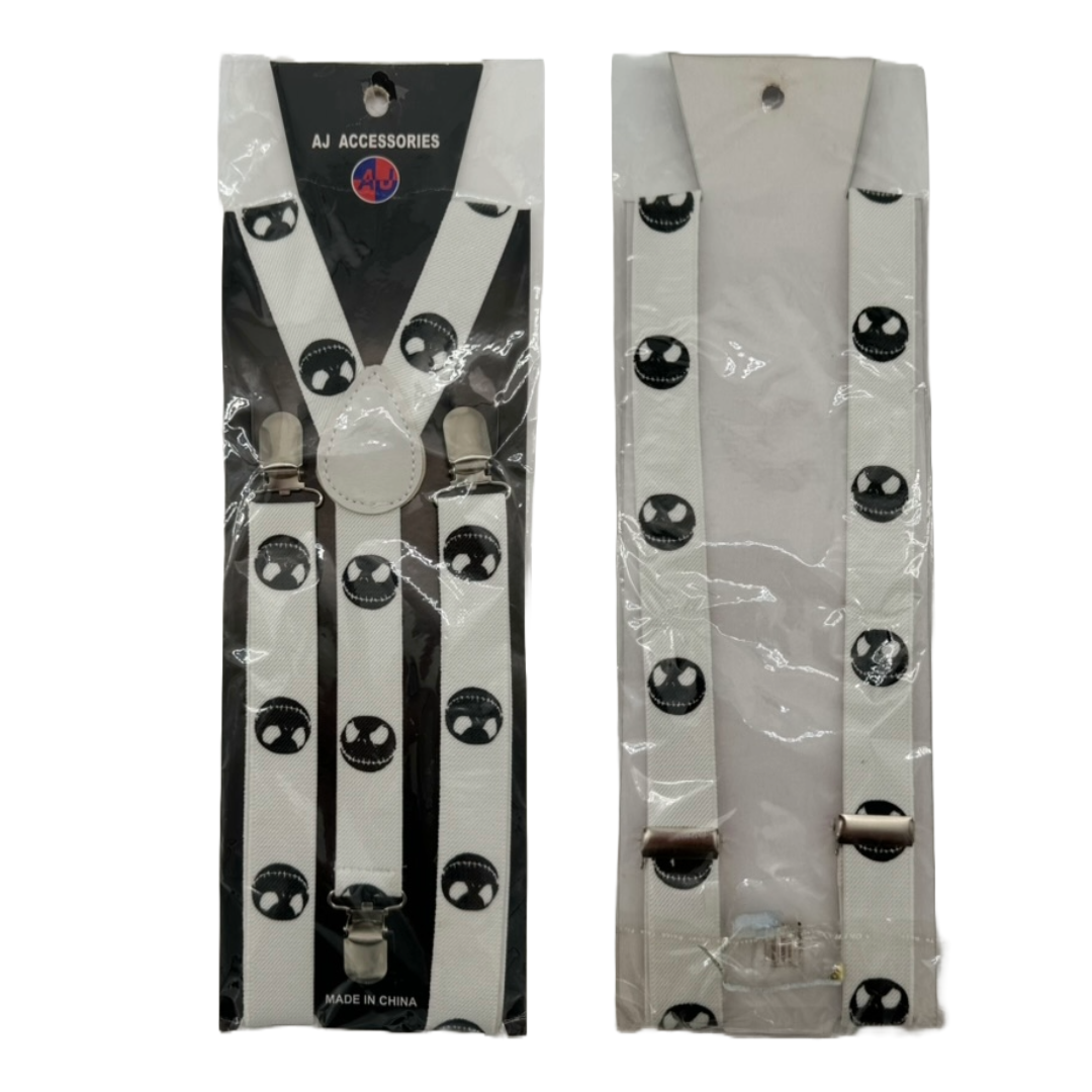Upgrade your style with these Walt Disney Movies TV Shows Jack Skellington suspenders! Made with white and black colorings, these suspenders are not only fashionable, but also perfect for showing off your love for your favorite Disney movies and TV shows. Stay stylish and comfortable with these unique suspenders.